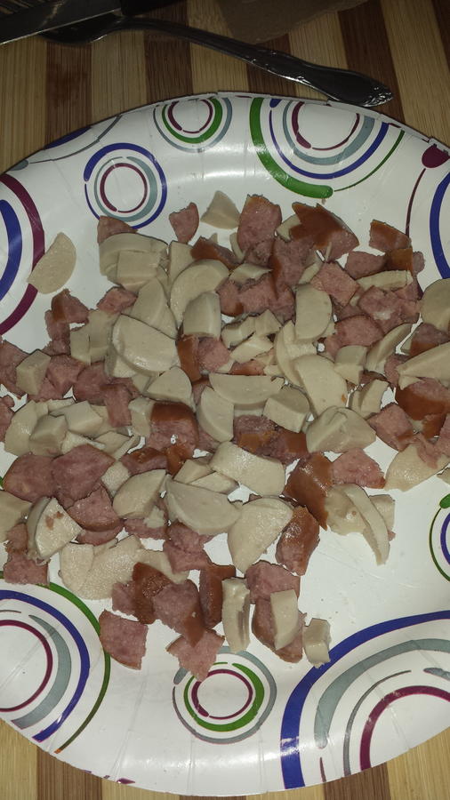 Came across a couple sausages. Ones a veel and the other is beef. Diced em up and threw em in.