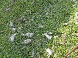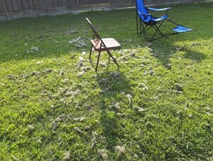 I often see little patches of hair when I mow, but it's usually from when a Fox, Skunk, or Hawk tears up a Rabbit since I mowed last time.