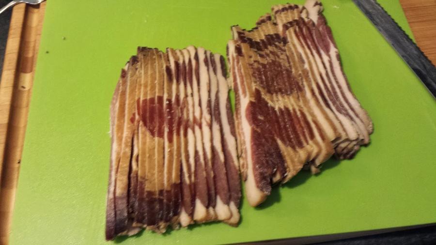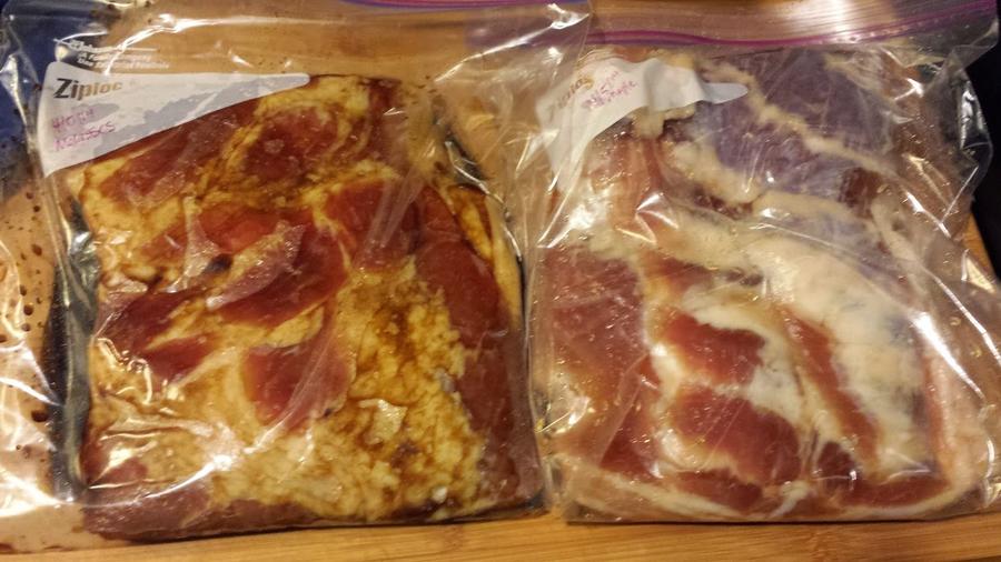 Decided to start my second batch today. This time I only put about 5 lbs in Pop's brine. The other 6 or so lbs ended up with a dry cure using diggingdogfarm's calculator. I rubbed in some maple syrup on (right) one and some molasses on the other (left). All of it is in the project fridge for two weeks.