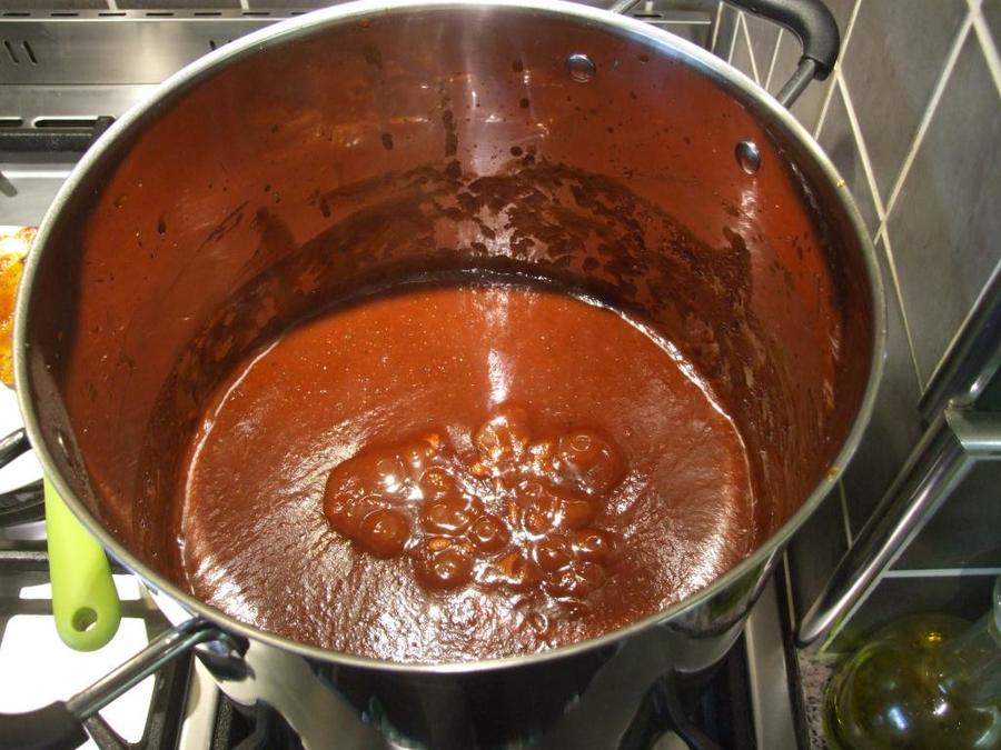 As blasphemous as it probably sounds there were a few modifications I did as I wanted it smoother:  after the initial sauté of veggies I puréed them in a blender to even out the consistency with the rest of the liquids.  I also had a batch of my own ketchup I make from scratch and used that instead of the store bought kind.  I think that means I'll have it less sweet (the store kind has high fructose corn syrup in it) and possibly a little less vinegar as well.  We'll see how much it affects the overall flavor.