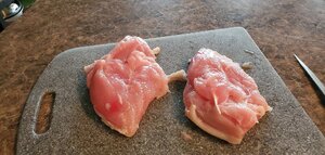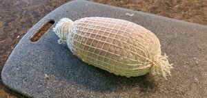 I lay the skin out and scrape any visible fat . Then wrap around the breast halves and into some # 28 netting . Back in the fridge over night .