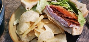 Soup and a turkey BLT sounded good . Soup is Bear creek vegetable barley mix .