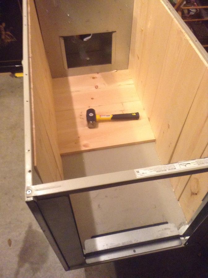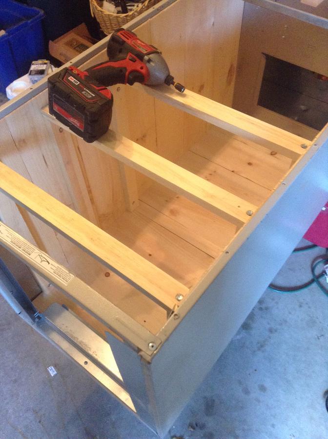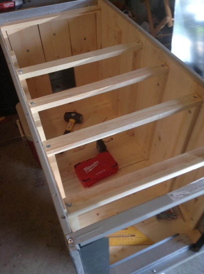 I was time to and the railing for the racks. I just screwed on 2' wide strips of pine. I cut my door out of the 16 gauge metal prior to putting the wood in. From all the pounding the cabinet was now off by a 1/2", so I add front sections to the railing to try and pull it back in to shape.