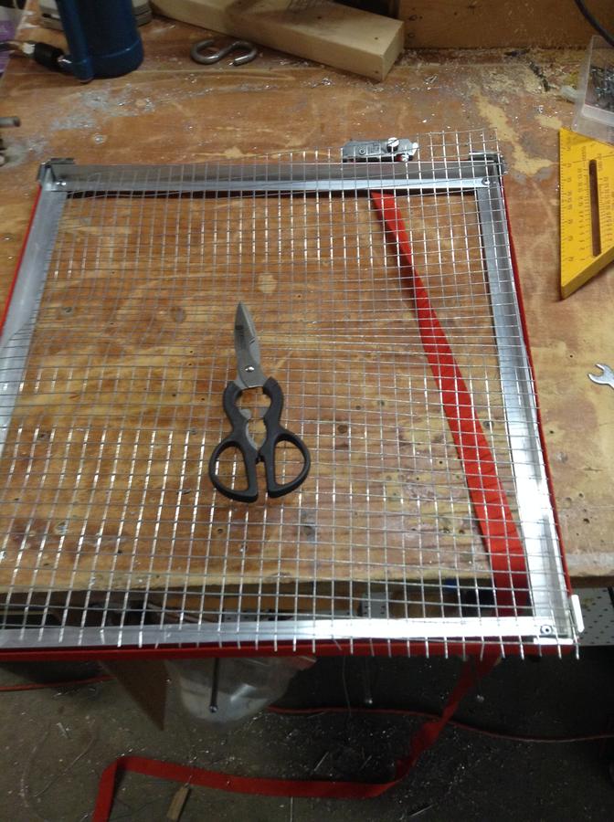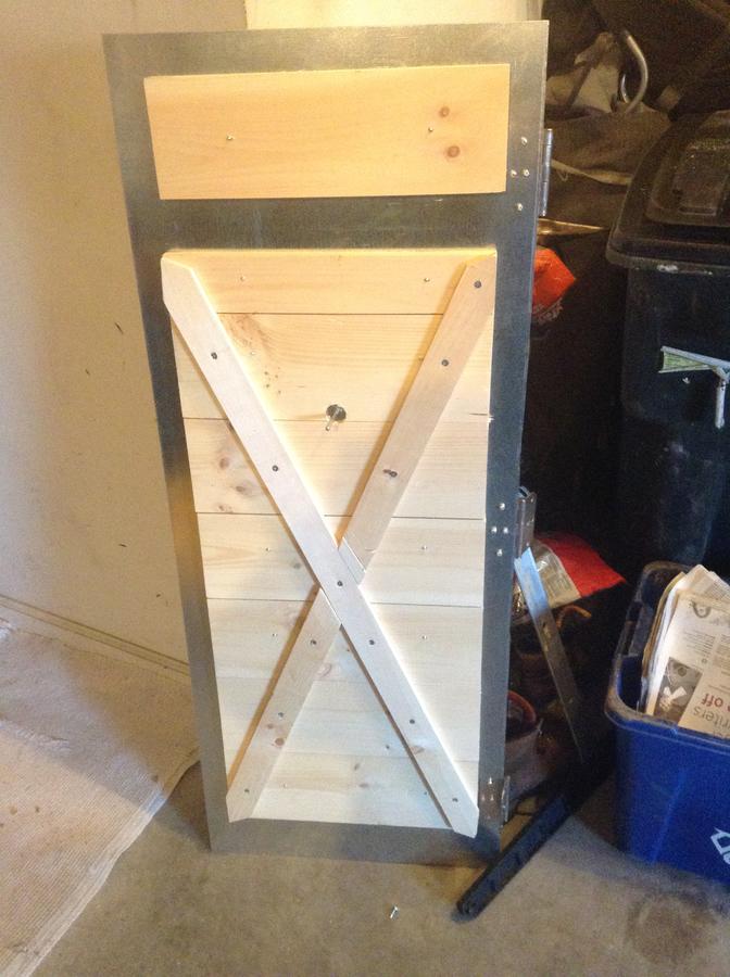It was time to work on the door. I knew I wanted to add wood for insulation. I used machine screws to attach the wood. After it was done it still flexed up and down, so I made an X. I attached the hinges using pop rivets. Drill a hole in the metal and door to add my thermometer.