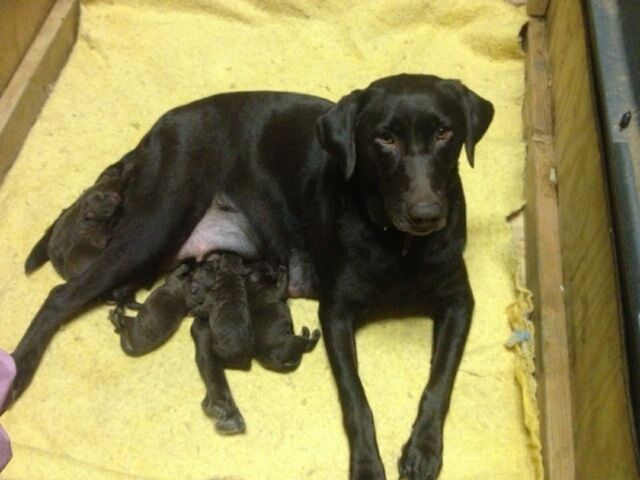 Gracie is a dark chocolate Lab. She has a highly trainable mentality; with a no holds bar attitude that is all go! She's great with other dogs, kids, as well as other household pets. Strong and lean 55lbs is her normal working weight. I can provide pedigree if needed.