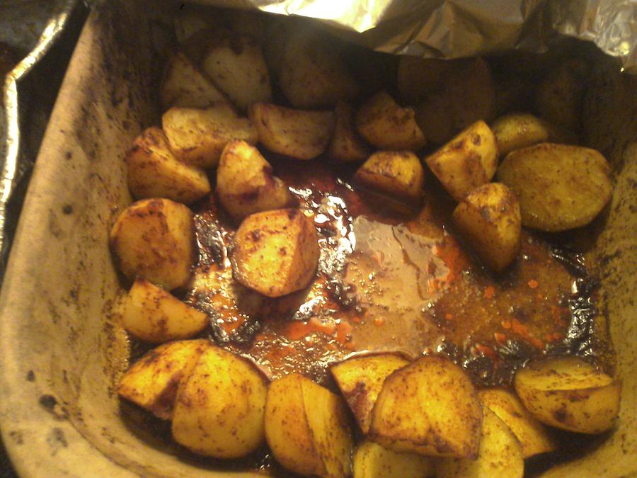Cut red potatoes into inch pieces. Mixed them in a homemade sauce. Baked at 400 for 50 minutes.
