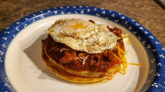 2 Masa harina pancakes , chili , cheese and an over easy egg .