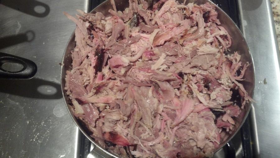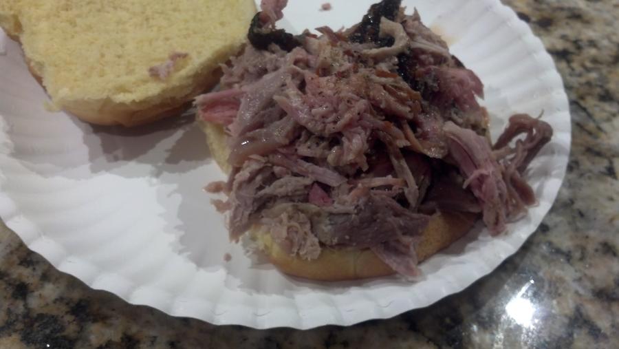 The two pictures below are the end result of today's smoke. The first pic is all the hand-shredded meat in a bowl, and the second is a sandwich topped with my finishing sauce. As I mentioned in a previous post, I add a dash of Texas Pete to my finishing sauce for eating. I let the meat sit for about 45 minutes before pulling it, and MAN did it pull. It was crazy how easy it was to shred. For now I'm storing the meat and sauce in the fridge in separate containers, but tomorrow or Monday I'll probably freeze some of the 'cue. Haven't decided whether I'll mix the sauce in with the meat or just bottle it and store it in the pantry.