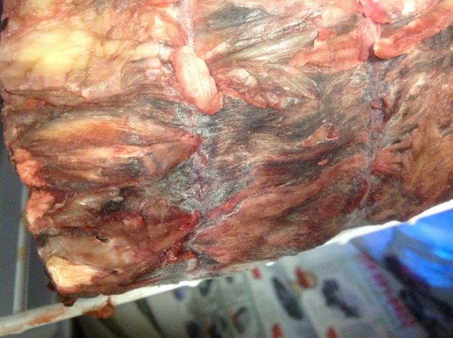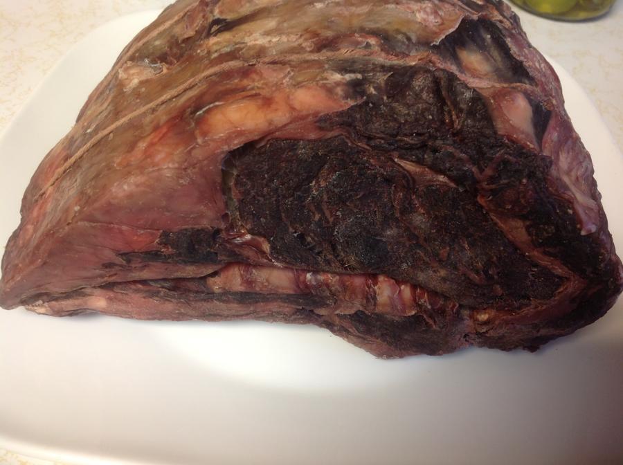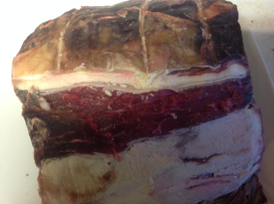 Roast after 45 days of dry aging. The slight amount of mold as seen is normal.