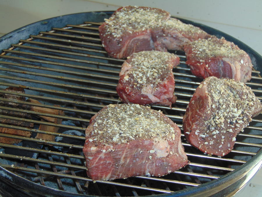 No recipe is needed here: I kept the seasoning simple with SPOG. This is such a great tasting, tender cut of Beef that I wouldn't dream of insulting it by going overboard with spices. KISS method, here. I used fresh crushed (with Mortar & Pestle, not cracked) Black Peppercorns, fresh crushed Onion, Kosher Salt, and granulated Garlic.
