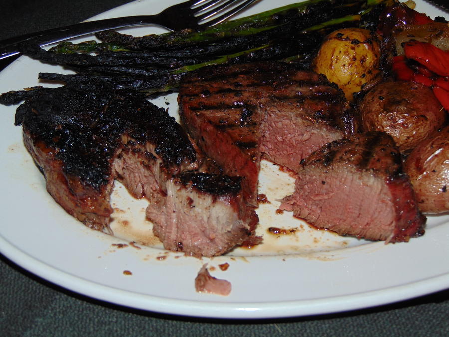 FILET MIGNON WITH MARINATED GRILLED MIXED PURPLE/RED/YELLOW BABY POTATOES, PEPPERS & ONION, MARINATED GRILLED ASPARGUS - FOR TWO