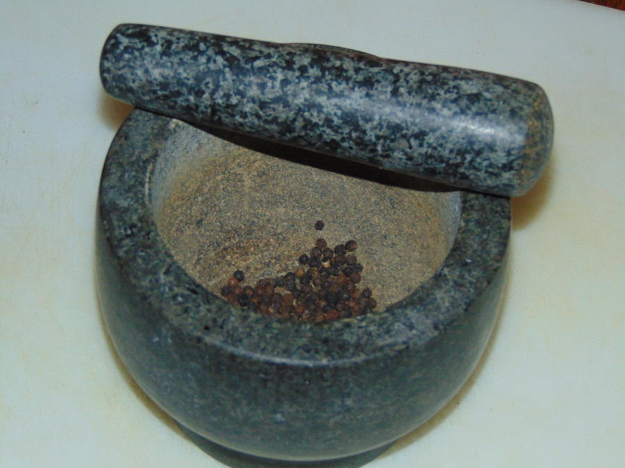 Working my Peppercorns and Onion with Mortar & Pestle (if you don't have one, I recommend you add it to your list as it can really open the doors for creating unique flavor profiles from your dry rubs):