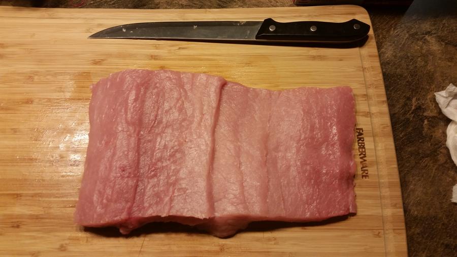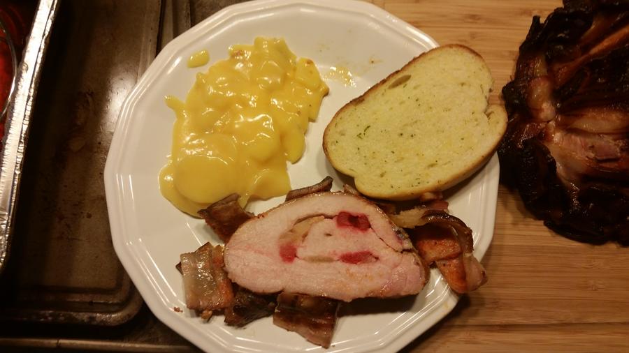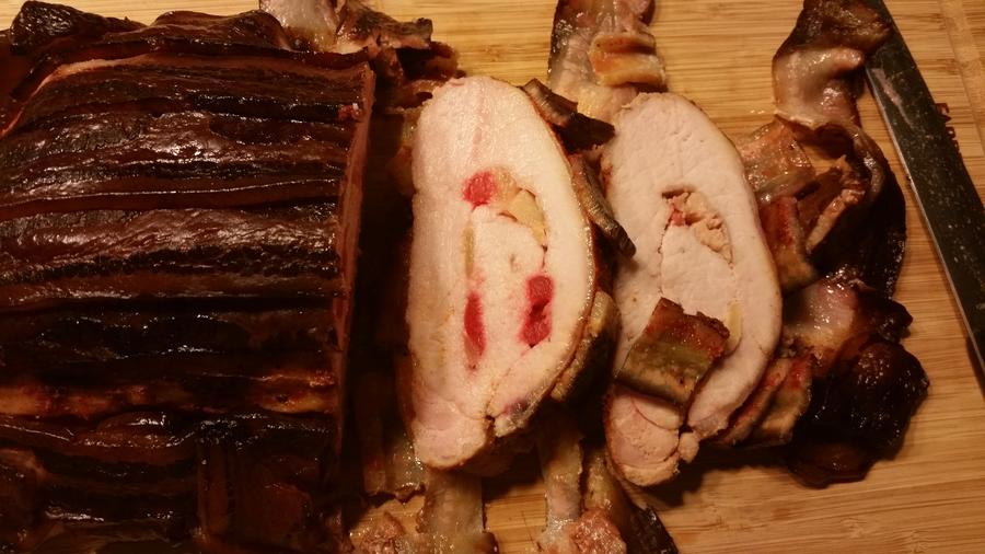 hmmm, let's try pineapple and some sliced cherries. Then rolled it, sprinkled with Jeff's rub, wrapped and set in fridge overnite.