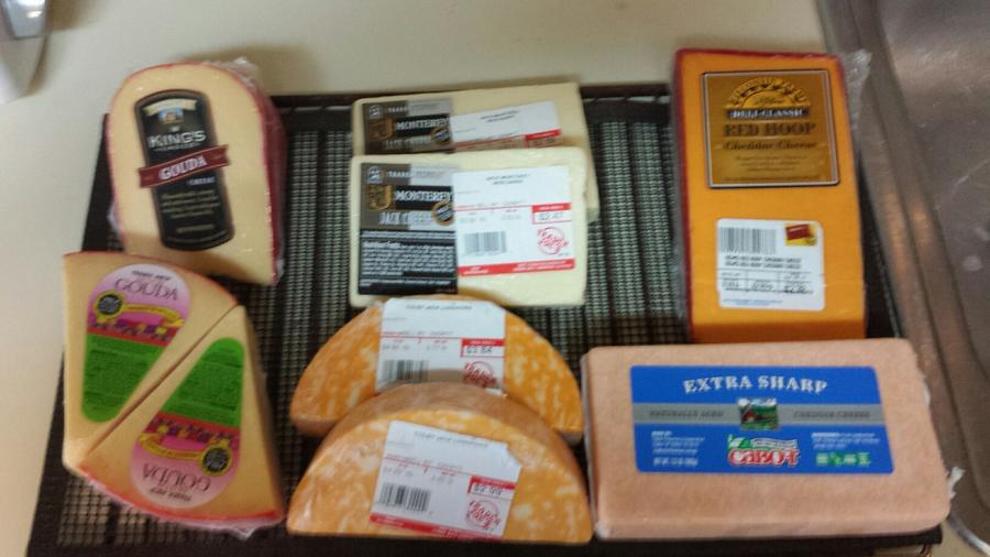 Left to right - Gouda, Colby, Colby Jack and two different chedders