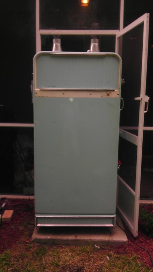 The fridge is almost finished. I ripped it apart again a few days ago to insulate it a little better so the element doesnt have to work so hard. Instead of fastening the element inside i set it on some bricks in the bottom and this seems to work really well. The only problem I am running into now is condensation build up. It started to rain when I was cooking with it the other day so I put some covers about 4 inches above the smoke stack and it was covered with condensation. after finishing the cook ( which turned out horrible due to no temp control. controler is getting repaired and should have it back soon) I noticed a lot of water inside the chimney and where that water had dropped down into the cabinet onto me water pan shelves. If you look at the pictures I posted earlier you can see the shelves that two water pans sit on. I have not yet put in a vent at the bottom. I am still trying to come up with a way to control the air in and out. I like the idea that Walleye gave me with a ball valve but as you can see its a tight fit getting the fridge out of my patio door. Hopefully you guys can give me some ideas so I dont get that nasty creosote that everyone talks about. I am finishing up some touch up pieces and will post final pics here in a few days,