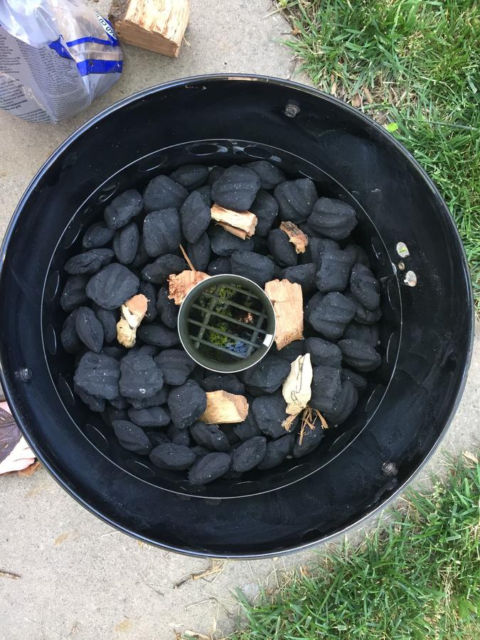I went with this version of the Minion Method. The reason i went this way is when I was seasoning my cooker I used the traditional Minion and I had trouble with high temperatures. I thin this way will have less heat and more controlled timing on wood smoke.