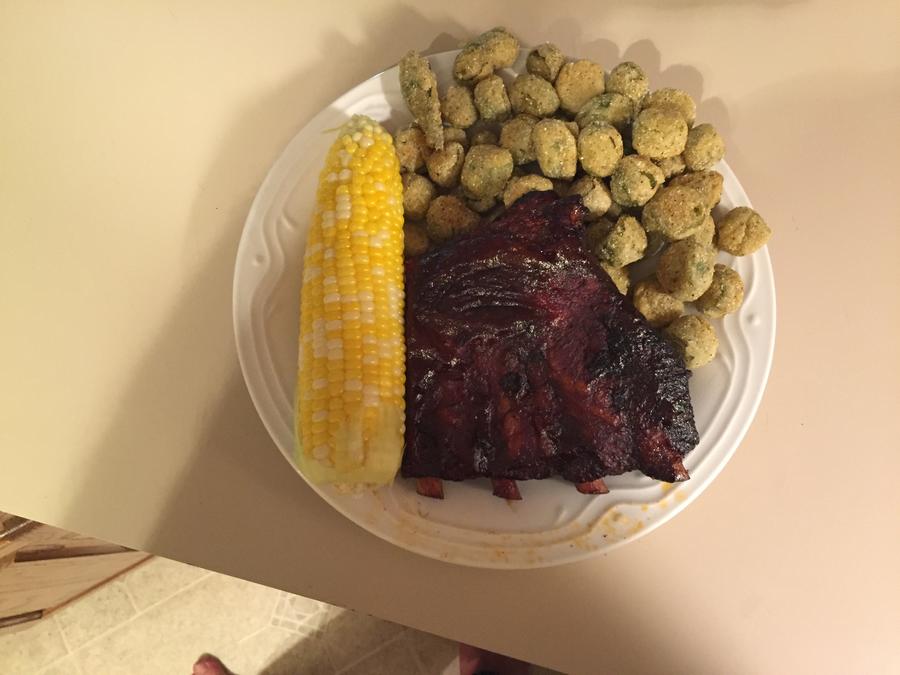 Ribs, sweet corn, and fried okra...doesn't get much better than that!  Save me a plate.  Nice job on the first smoke.  Looks great.