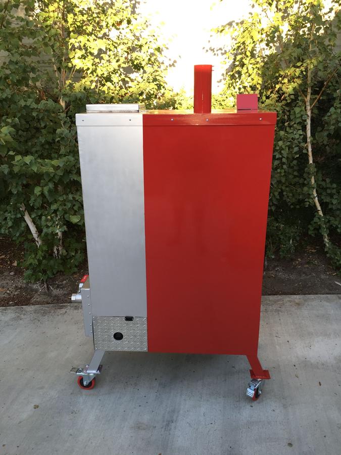 My gravity fed smoker has an internal fan and wiring for hassle free electronically controlled temperature regulation. In can run on 12v DC or 120v AC. The steel cost me $800. The entire temperature system cost $50. I painted it with Rustoleum paint, the red paint is their 500 degree Ford Red Engine Paint, the silver is their 1200 degree Metallic Silver Ultra High Heat paint. I did this because I was concerned about that side panel getting too hot from the firebox. Results look great! I purchased the paint on Home Depot's website $100. It took 7 cans of red and 2 silver. The door handle is from a Viking Dishwasher that I bought on eBay for $40. The 1.5" ball valve is from Smokey Maple and is 304 Stainless Steel purchased on eBay for $35 (super cheap!). Red Casters were purchased from Home Depot in store (and they are super smooth). The final build cost was about $1300 and it took me about 5 months every other weekend to complete.