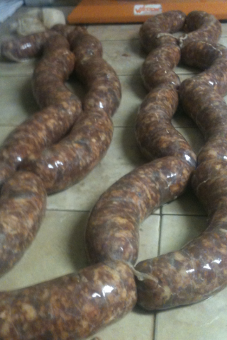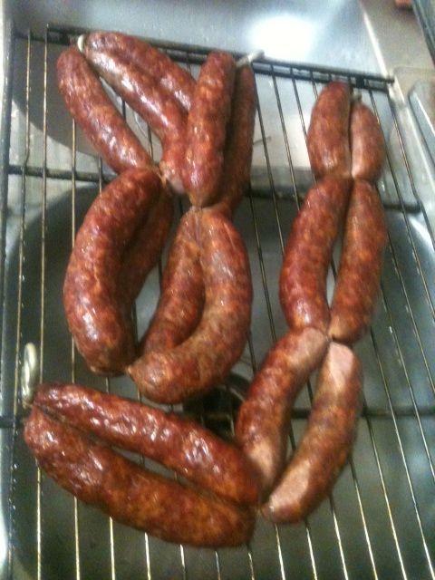 Ive been working on this Linguica for about 3 days now. I ground and knife cut my shoulder. The shoulder btw was farm raised, slaughtered by my brother inlaw the same day I picked it up. farm to table. I robbed a few different recipe's here and there. It turned out pretty d@mn good. Used about 5 1/2 lb lean to 2 lb fat. 1 1/2 T marjoram, 1 1/2 T white pepper, 1 T cayenne, 2 1/2 T Paprika, 1/2 T allspice, 1/4c red wine vin, 1/2c red moscato wine, 3T salt, 1T Annato, 1/2T sugar, 1/4 c nonfat powder milk, 1 1/8 instacure#1. I let them hang cure over night and let them dry out. started them off at 130 deg. for about an hour, then bumped em up to 150, then 165, then finished them off at 180. good spice.I might have to bump the powdered milk to 1/2 c next time. Thanks for lookin.