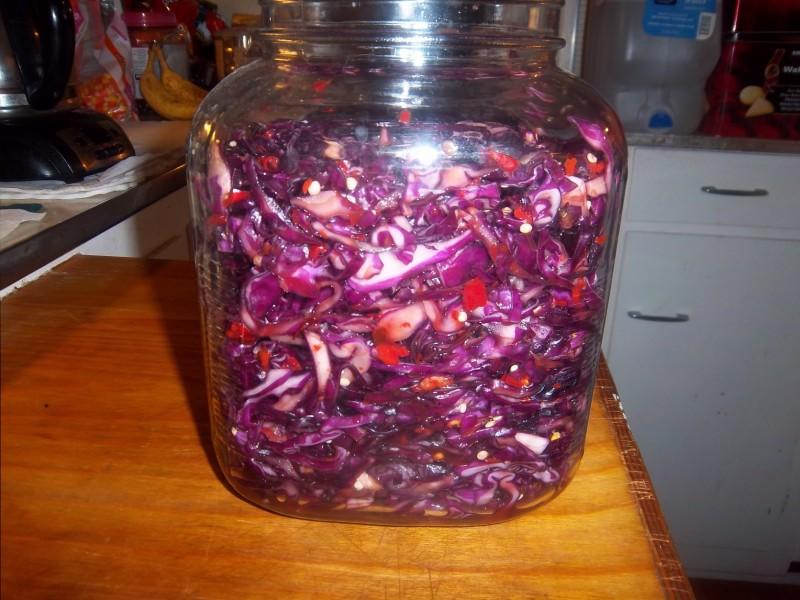 That time of year again with the weather cooling down here in the PNW to do up some kraut and Kim Chi. I saw a version of Kim Chi in Bon Appetit magazine that used BS for the main ingredient (baby cabbages?) so I had to try some. Put up about 2 pounds of BS in a brine for 4 hours then packed in jars with the spices and Korean pepper & now must wait 3-4-5 days for some fermentation to get going. Three pounds of shredded red cabbage with large amounts of garlic and peppers put up in a glass jug for a 3 or 4 week rest to mature. It smelled absolutely delicious just sitting there fresh so looking forward to some fermented goodness soon.
