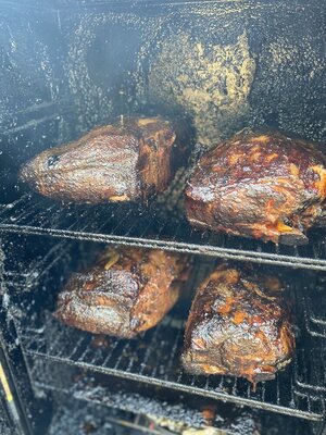 So far, so good! A little crowded but the smoke did its thang. I am using pecan and I am trying a new mop sauce. It is called T and T. It is sold commercially but I made my own. I think you can put about any good seasoning in the lard and vinegar base, but it smells about as good as any thing I have had on the stove.
