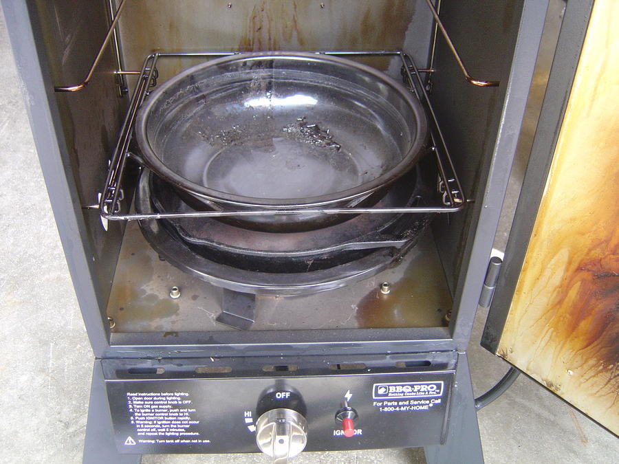 That seems to work much better and the wood burns much better. But now I had another problem. The water pan sits in a rack that has a large hole in the center, so that the water pan sits below the level of the rack by several inches. This puts the water pan so close to the frying pan that I was only able to use small wood chips and could not use larger wood chunks, which I like better. You can see what I mean in this picture.