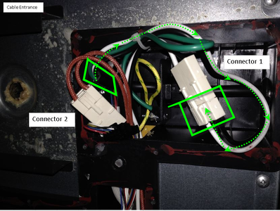 2. Connect wires #2 and #4. Notice the white wire comes out of the upper right hole/port and the black braided wire comes out of the upper left hole/port. The pic is bad so I tried to erase extra wires and used a Green line to trace the wire and connections. I hope it gives the proper visual.