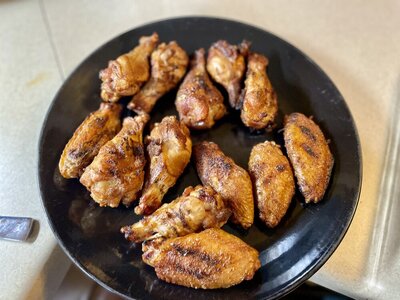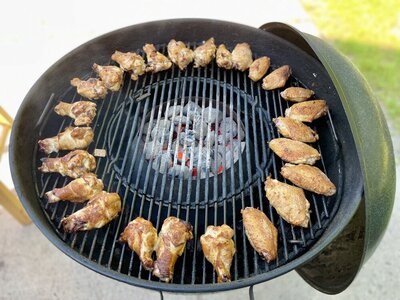 Made some wings on the vortex again on my 22” kettle. The 22” has become mostly my go to for the vortex because of the heat it makes I don’t want to use it on my 26” kettle. But I rubbed them with some SPOG along with some cornstarch which might not be needed with the vortex. I used some pecan chips above the vortex and they turned out great. I’m working on a sweet bbq sauce that is mostly heavy with brown sugar, some ketchup, butter, agave and some garlic pepper. Anywhere here are the pics. The bbq sauce I’m trying to duplicate a recipe from a restaurant in Northwest Ohio called Jed’s that is my favorite sauce. This was my first attempt while it was good. It’s not there yet.
