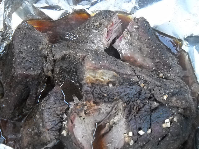 I'm leaning towards a wrap of both the meat the pan, just to make it easier to transfer to a cooler to rest when ready...but I don't want easy, I want correct. And to me, correct would be a chunk of chuck ready to pull apart with a fork.