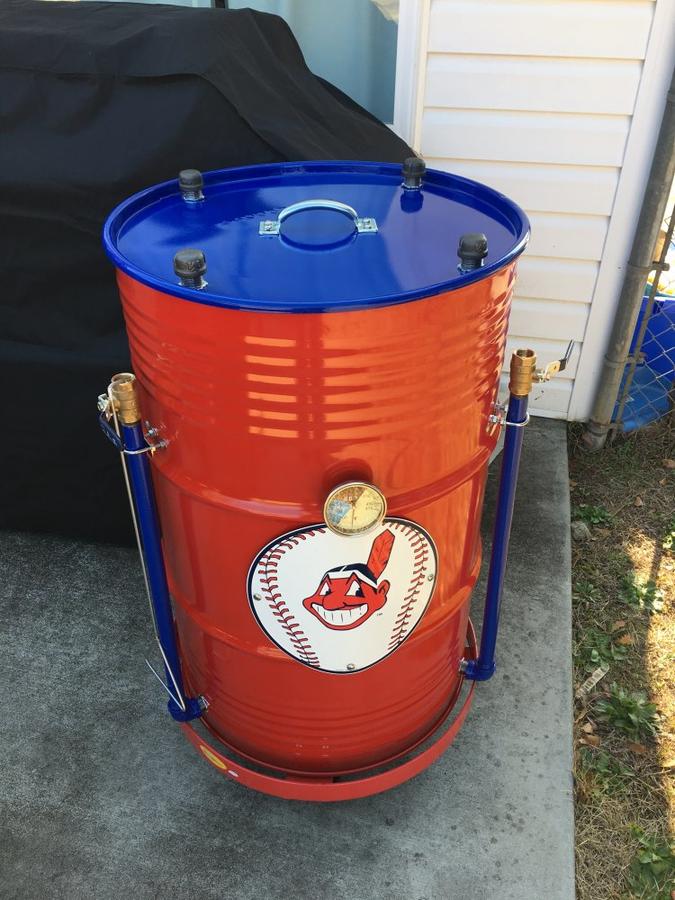 I just got finished building my son-in-law a new U D S for his birthday and since he is a huge Cleveland Indians fan thought I would build with the Indians theme. Turned out pretty good I thought. Found a place near me that powder coats for a very reasonable price and can do about any color I need and powder coating is the absolute best way to go. Thing works and holds temperature very steady and he loves cooking on it.