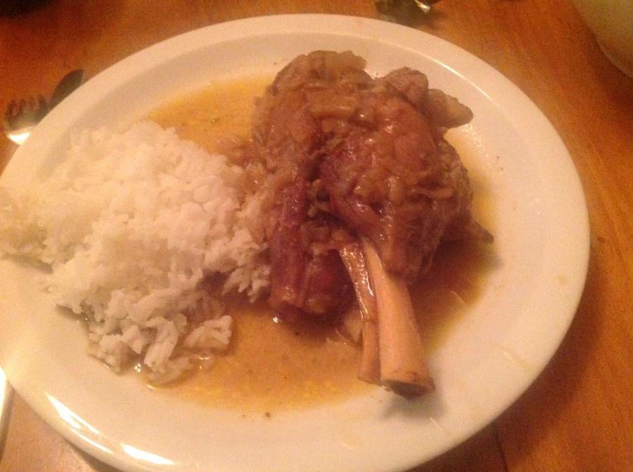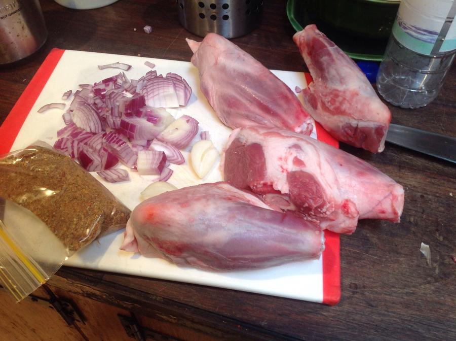Put shanks back in 2 fat tabs of spice mix, give a good stir,add chicken stock to cover, 1 cinnamon stick. Into low oven.