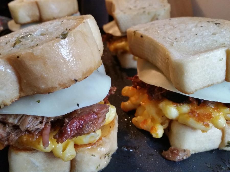 Did the same with the pulled pork. Make sure it is not too wet.... stack on the mac & cheese