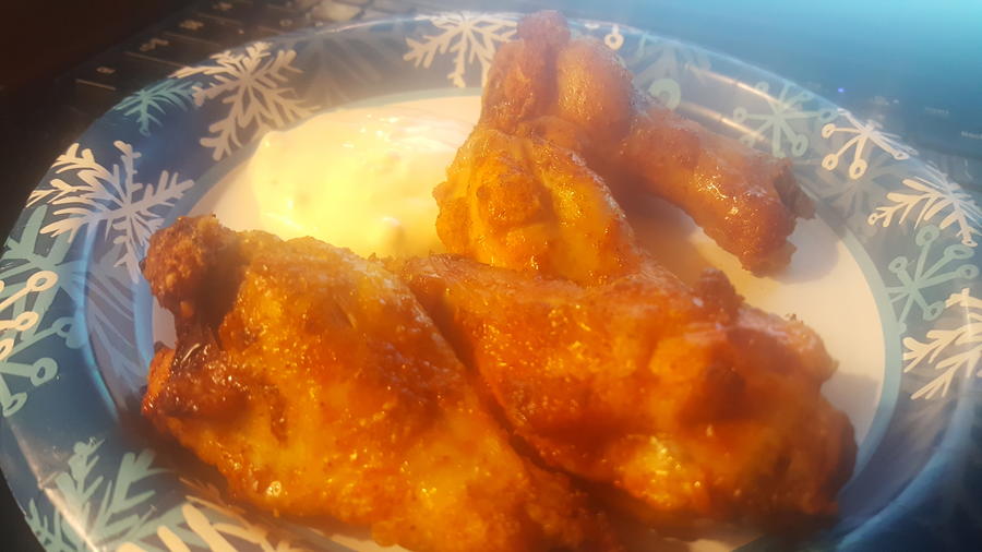 Wings injected with 1:2 ratio of creole butter and Frank's buffalo sauce.   They are now marinating in the remainder of the sauce: