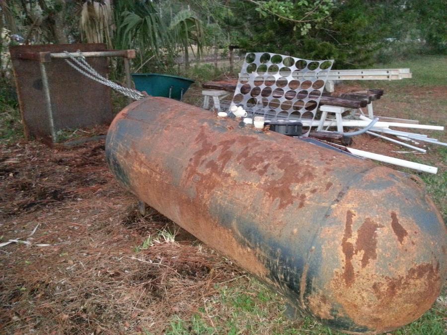 I know your excited, but you have to be patient to be safe.I ave seen first hand the damage an exploding tank can do. Not a pretty sight. As stated by a couple others, use a weed burner, turkey fryer burner, gas grill, anything to use up any product left inside. Then unhook the burner, open the valve to get any remaining low pressure out then start pulling your fittings. Brass (Non-sparking) jaw pipe wrench is the preferred. We always dry iced a tank before pulling, during transport, and while cutting. Straight propane, or even gas for that matter is not a problem. The problem is when the vapors mix with the correct amount of air that it becomes volatile. I have seen weldors drill a tiny hole i natural gas lines to see if they were live. Some were. A local weldor told me once he drilled into a propane tank that was supposed to be empty. It wasnt. His logic was to drill it to make sure before torching in. Didn't make sense to me why he didn't just open the valve to check. If you have never cut a tank open before either have someone experienced do it, or err on the extreme side of caution. You may not even know the results if it goes bad. Be safe, and remember, We will be watching for the first smoke from the stack.