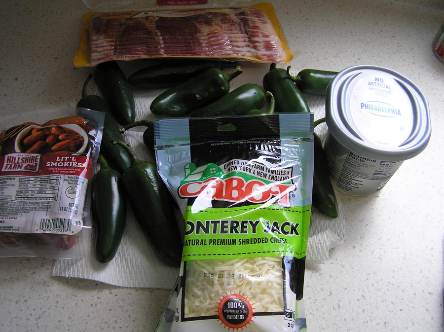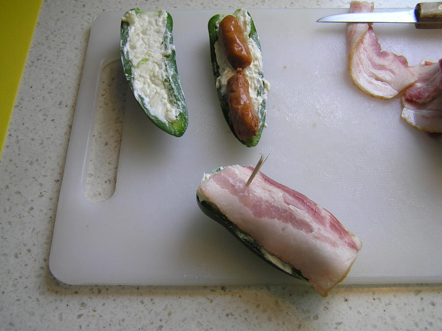 Mixing up the cream cheese and the monterey jack.I'm using 1/3 third piece of bacon with a lil smokie cut in half.