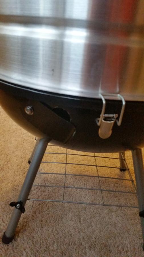 The BBQ Pro grill came with clamps to secure the grill lid to the grill base (for transport) so I just bent them over a little further so I can lift the pot with its handles and the grill base stays attached.  All I have to do is lift the clamp latch and they come loose easily in order to reach the coals.  Additionally, the grill did not come with a bottom damper, which was a bonus because I had already purchased a step bit from Harbor Freight to cut holes in the side of Smokey Joe, so I decided to experiment on this one.  Below is a pic of the dampers I made with the left over aluminum that I had left over when I cut out the pot base and pot lid.  There is a 1" hole on either side of the grill base.  I was able to make them curved so they fit snug against the grill and they hopefully work well.