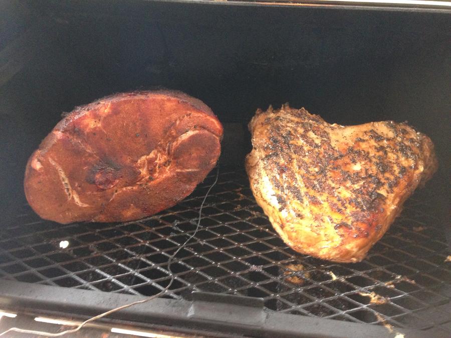 This year, we had some folks who wanted ham, so I smoked an 11.5 lb turkey breast and a ham. I never mind throwing a ham in there with the turkey, as I can get the internal temp of a ham up to 145* in the same 3 hours it takes to get a turkey breast up to 165*. I used the same rub as above on the ham...and it was perfect. One thing I did do different this year though is my brine and rub for the turkey.