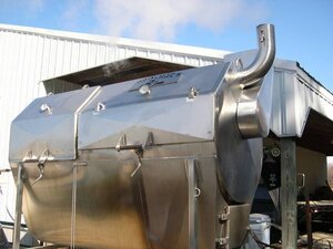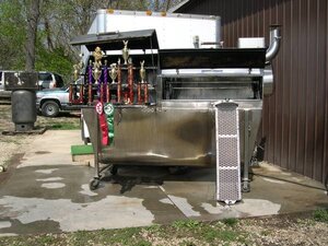Custom designed Stainless Steel Wood fired Smoker with rotisserie. One of a kind design. Over 51 sq.ft. of cooking surface. Electric rotisserie. Has 6 rotisserie shelves and 3 slide out shelves. Cooks with wood smoke and steam.