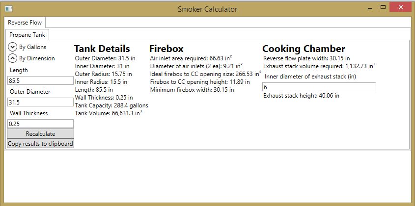 You can enter the tank volume if you don't have measurements (I.E. 250 gallons), but you can't calculate the firebox opening from this. You have to actually enter the length and diameter of the tank. It asks you for the thickness of the tank walls to calculate the inner diameter, used in calculating the firebox volume.