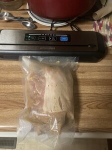 Weight of the loin was approx. 2 lbs., a full handful. Mrs. Wurtz made the sides: seasoned peas and carrots in chicken stock, mashed potatoes (with cream/butter) and a grilled onion. I didn't use the pork butt or bacon, onions were saute' not raw that as called for, I cooked the pork loin to an IT of 145F, which actually reached 158F range after 2 hours on the spit.