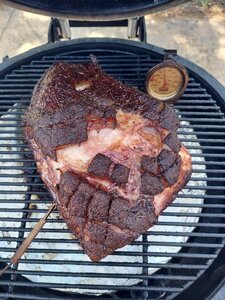 Smoked an 8 pound Boston butt today. Rubbed it down on last night to hang out in the fridge. Put it on this morning at 7 at 270. Used a komado style grill and burried my wood chunks in the charcoal. I never tried that before but it was a winner. I had a thin blue smoke all day. Not bitter white smoke which I always seem to have some of. I mopped it every 45 minutes. Mop consisted of water, white vinegar, red pepper flakes, kosher salt and lemon.