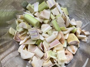 I started out with about 10lbs of pork, then my ingredients which were very unique ingredients like lemongrass, kaffir lime, galangal, turmeric, Thai chilis, fish sauce and shrimp paste.