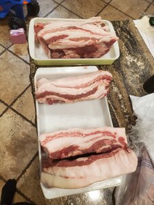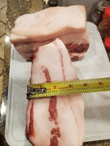 I just got half of a pig that my bro-in-law raised and butchered. Some of the pork belly cuts are 3-4 inches thick and mostly fat, and I'm concerned that curing them as is, the cure won't penetrate well, so I'm thinking about slicing these in half to get 1.5-2 inch thick cuts, but then one will be mostly fat. Or just need to trim and use fat for something else?