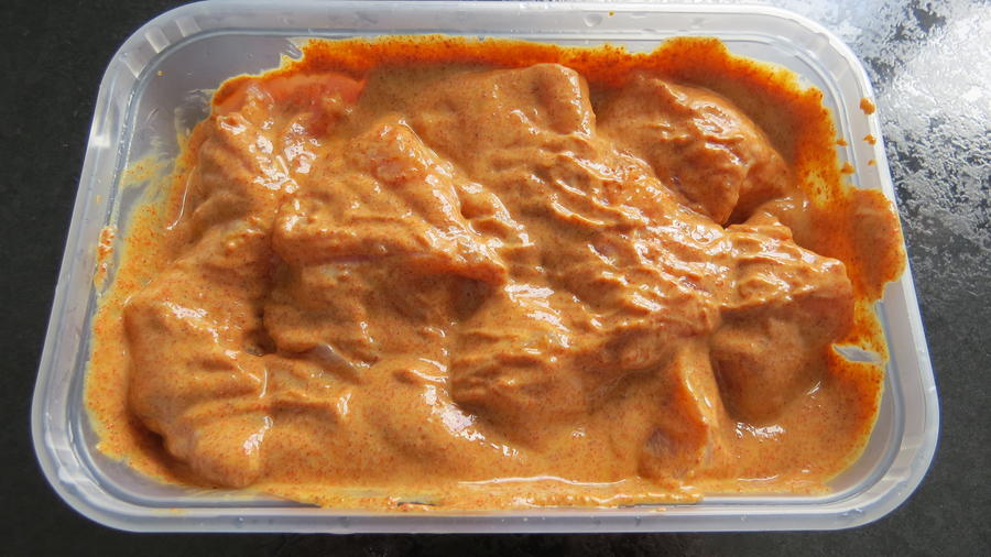 Chicken, Natural Yogurt, Tandoori Spice Mix and a splash of Lemon Juice. Marinated overnight.