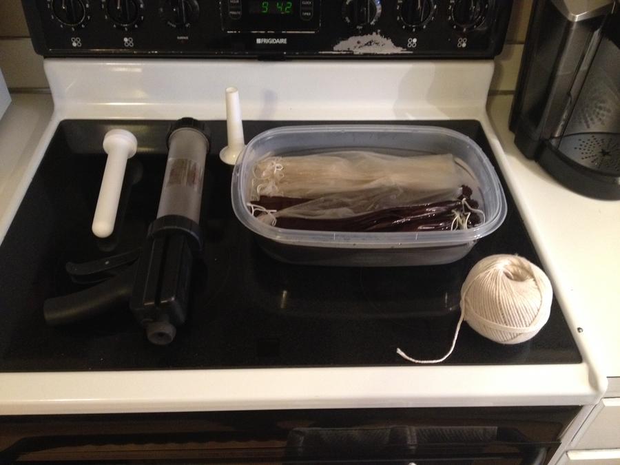 Stuff the meat in the sausages making sure there are no air bubbles inside the casings. Twist them tight and tie them off with butcher string and leave some room to tie a loop to hang the sausages in the smoker if your casings don’t have a loop on them already. Just FYI, I stuffed the casings on Friday night.