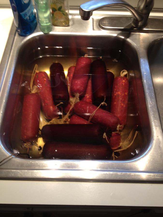 When the internal temperature of the sausages came up to 152 degrees, I pulled them out and soaked them in an ice bath in the sink. Leave the temperature probe in the sausages while they are in the ice bath, let them soak in ice until the Internal Temperature comes down to 80 degrees. While the sausages were cooling, I turned the smoker off, opened the doors, and let the smoker completely cool off. After the internal temperature of the sausages cooled down to 80 degrees, I hung the sausages back in the cooled smoker to bloom for 3-4 hours. It was a cool day outside, so I just let them hang outside in the smoker, because my wife would have killed me for letting sausages hang in the house. You can let them hang wherever you want though.